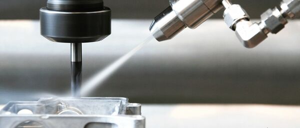 Die patentierte Zweistoffringdüsen-Technologie sorgt für einen konstanten Druck, der eine Vereisung der Düse verhindert und eine gleichbleibend gute, externe Kühlung sicherstellt. Dabei wird nur so viel Kohlendioxid zugeführt, wie für die angestrebte Kühlwirkung erforderlich ist. Im Bild: Zerspanung eines Aluminiumteils.