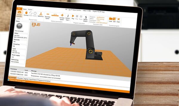 Mit der «Igus Robot Control» lassen sich verschiedene Roboterkinematiken programmieren und steuern. Ein digitaler Zwilling simuliert die Bewegungen.