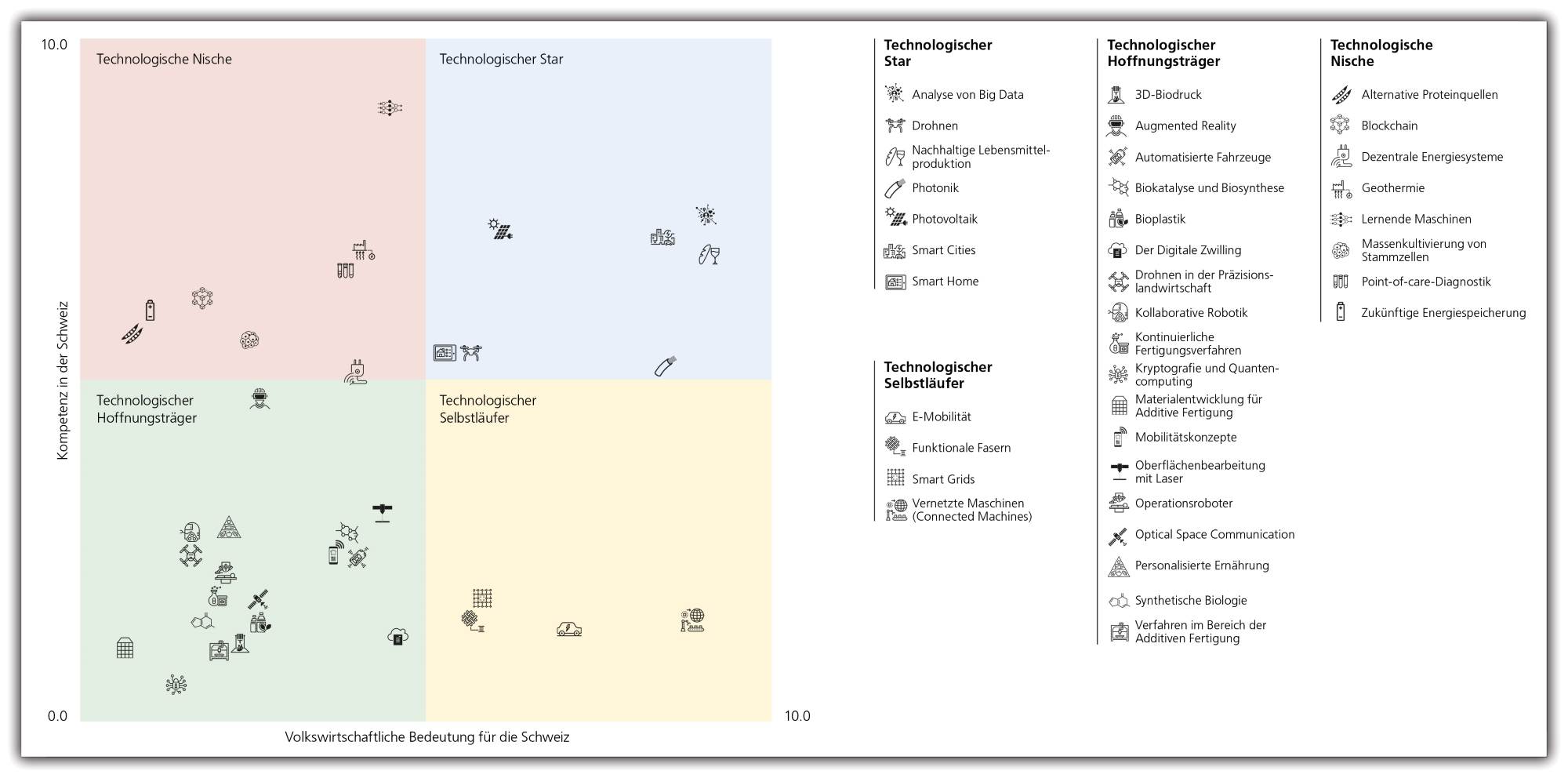 Erstmals wurde der Technology Outlook mit semiquantitativen Angaben hinterlegt. Diese basieren auf dem Wissen von Expertinnen und Experten sowie auf umfangreichen Recherchen und erlauben es, die relative Bedeutung der einzelnen Technologien für die Schweiz abzuschätzen. «Stars», «Selbstläufer», «Hoffnungsträger» oder «Nischen» – jede Technologie wird aufgrund der Angaben einem von vier Quadranten zugewiesen, die durch die volkswirtschaftliche Bedeutung und die Kompetenz in der Schweiz definiert sind.