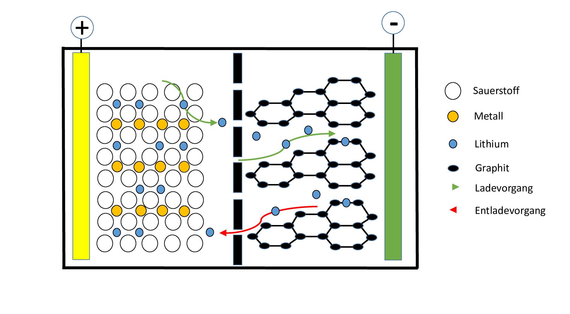 Beim Aufladen läuft der Prozess umgekehrt ab: Innerhalb der Batteriezelle werden die positiv geladenen Lithium-Ionen von der Kathode zur Anode transportiert, während in der Gegenrichtung über das Ladekabel die negativ geladenen Elektronen, also der Ladestrom, fliesst.