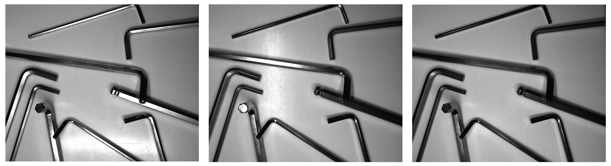 Als weiteres Beispiel nennt Sandvoss klassische Pick-&-Place-Anwendungen, bei denen glänzende, oft metallische Bauteile unter verschiedenen Beleuchtungs- und Polarisierungswinkeln in unterschiedlichen Bildbereichen immer zu Reflektionen führen. Durch die Kombination von reflektionsfreien Teilen der unter unterschiedlichen, teilweise virtuellen Polarisationswinkeln aufgenommenen Bilder zu einem Gesamtbild ist es möglich, gut auswertbare Bereiche zusammenzuführen und somit die Bildverarbeitung und Erkennung der Teile und ihrer Lage auf dem synthetischen Bild zu vereinfachen.