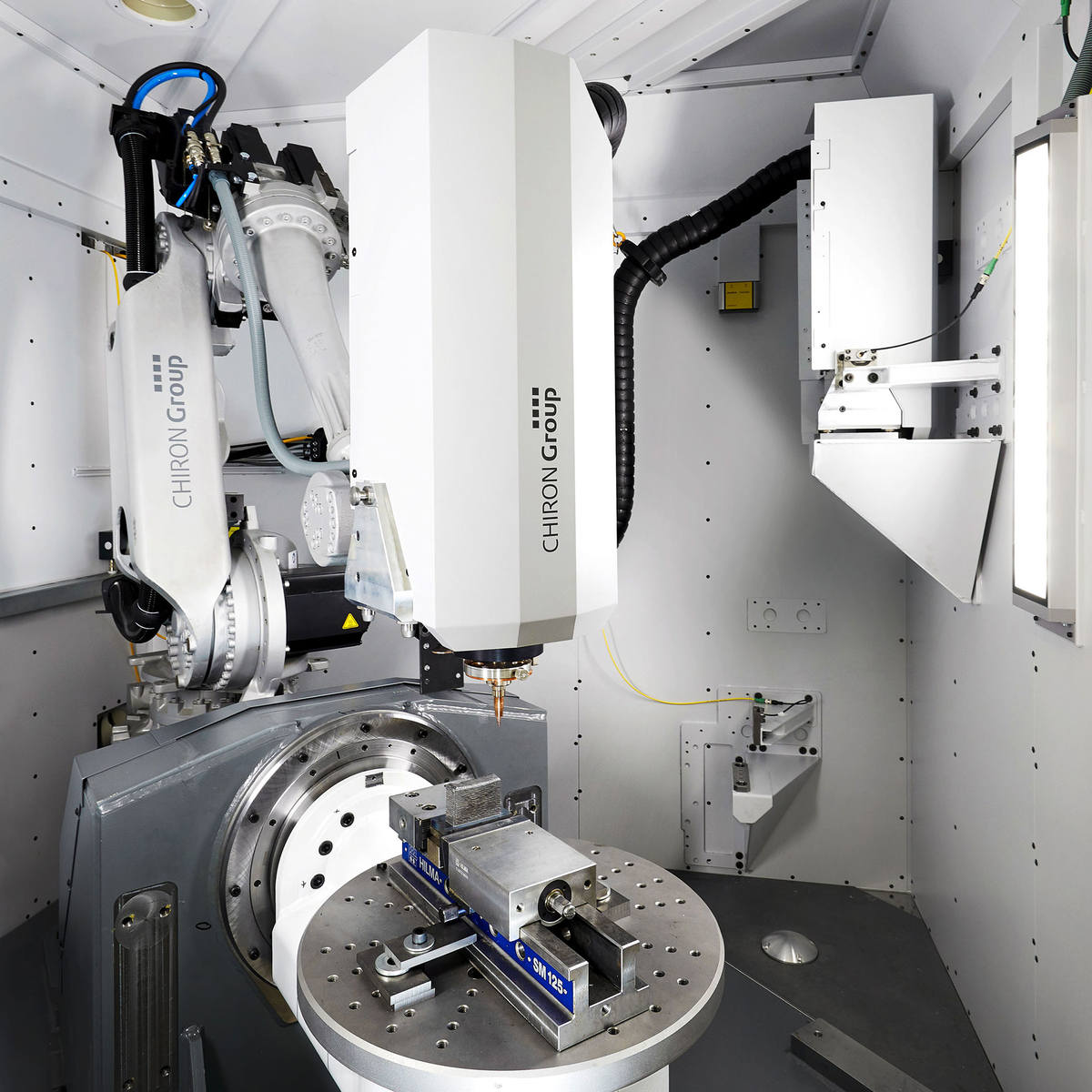Chiron hat die Anlage als Plattform ausgelegt und sie lässt sich mit relativ geringem Aufwand von 4-achsige auf 5-achsige Bearbeitung umrüsten. Ausgestattet mit modernster Sensorik erfüllt der 3D-Metalldrucker «AM Cube» alle relevanten Sicherheitsanforderungen für einen Betrieb ohne Überwachung durch den Bediener.