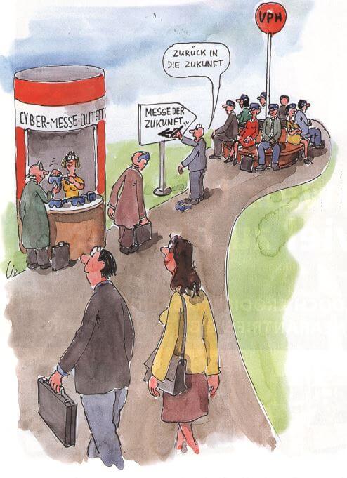 «Die Messegesellschaften waren selbst schuld, erinnert sich Wilhelma von Neustetten, die Marketingleiterin von Cyber-Fair, dem mittlerweile weltweit dominierenden virtuellen Messeplatz. Zu Anfang des neuen Jahrtausends war die deutsche Messewelt noch in Ordnung. Die Nase vorn hatte Deutschland mit dem grössten Schaufenster der Welt: Zwei Drittel der global führenden Messen aller Branchen fanden hier statt. Mit diesen Leitmessen und vielen anderen regionalen sowie überregionalen Ausstellungen verdienten die Messegesellschaften rund 2,5 Milliarden Euro.