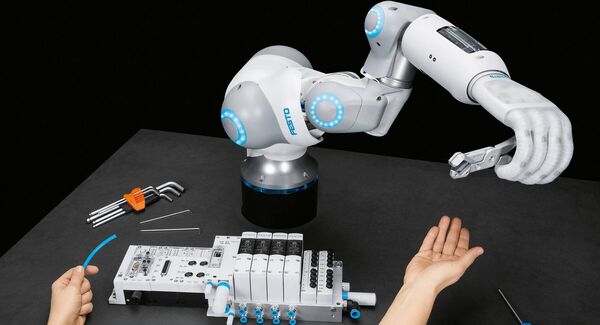 Ob greifen, halten oder drehen, tasten, tippen oder drücken – im Alltag nutzen wir unsere Hände wie selbstverständlich für die unterschiedlichsten Aufgaben. Dabei ist die menschliche Hand mit ihrer einzigartigen Kombination aus Kraft, Geschicklichkeit und Feinmotorik ein wahres Wunderwerkzeug der Natur. Was liegt da näher, als Roboter in kollaborativen Arbeitsräumen mit einem Greifer auszustatten, der diesem natürlichen Vorbild nachempfunden ist und durch künstliche Intelligenz lernen kann, verschiedene Aufgaben zu lösen? Festo zeigt auf der Hannover Messe 2019 die pneumatische Roboterhand BionicSoftHand. Kombiniert mit dem BionicSoftArm, einem pneumatischen Leichtbauroboter, eignen sich die Future Concepts für die Mensch-Roboter-Kollaboration.