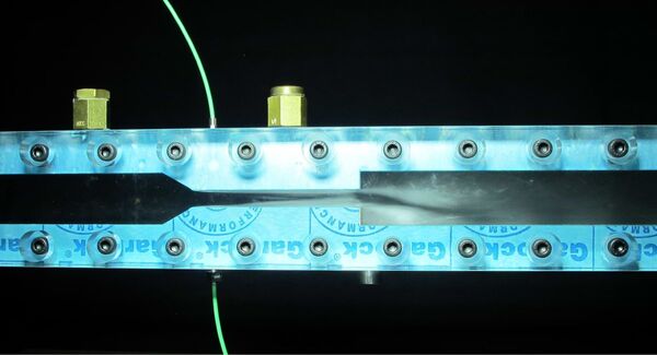Um das Phänomen der Kavitation grundlegend zu untersuchen, wurde ein vereinfachter Prüfstand (siehe Abbildung 1) mit Wasser als Arbeitsmedium realisiert. Das Wasser tritt von links in den Kanal ein, welcher sich verengt und dann sprungartig wieder erweitert wird. Dadurch entsteht an dieser Stelle ein Unterdruck, welcher ab einem gewissen Massenstrom so gross wird, dass Kavitation auftritt. Um die Dampfbläschen sichtbar zu machen, wurde der Versuchsaufbau mit seitlichen Plexiglasscheiben ausgestattet. Hochsensible Drucksensoren und High-Speed-Kameraaufnahmen dienten der Charakterisierung des Phänomens.