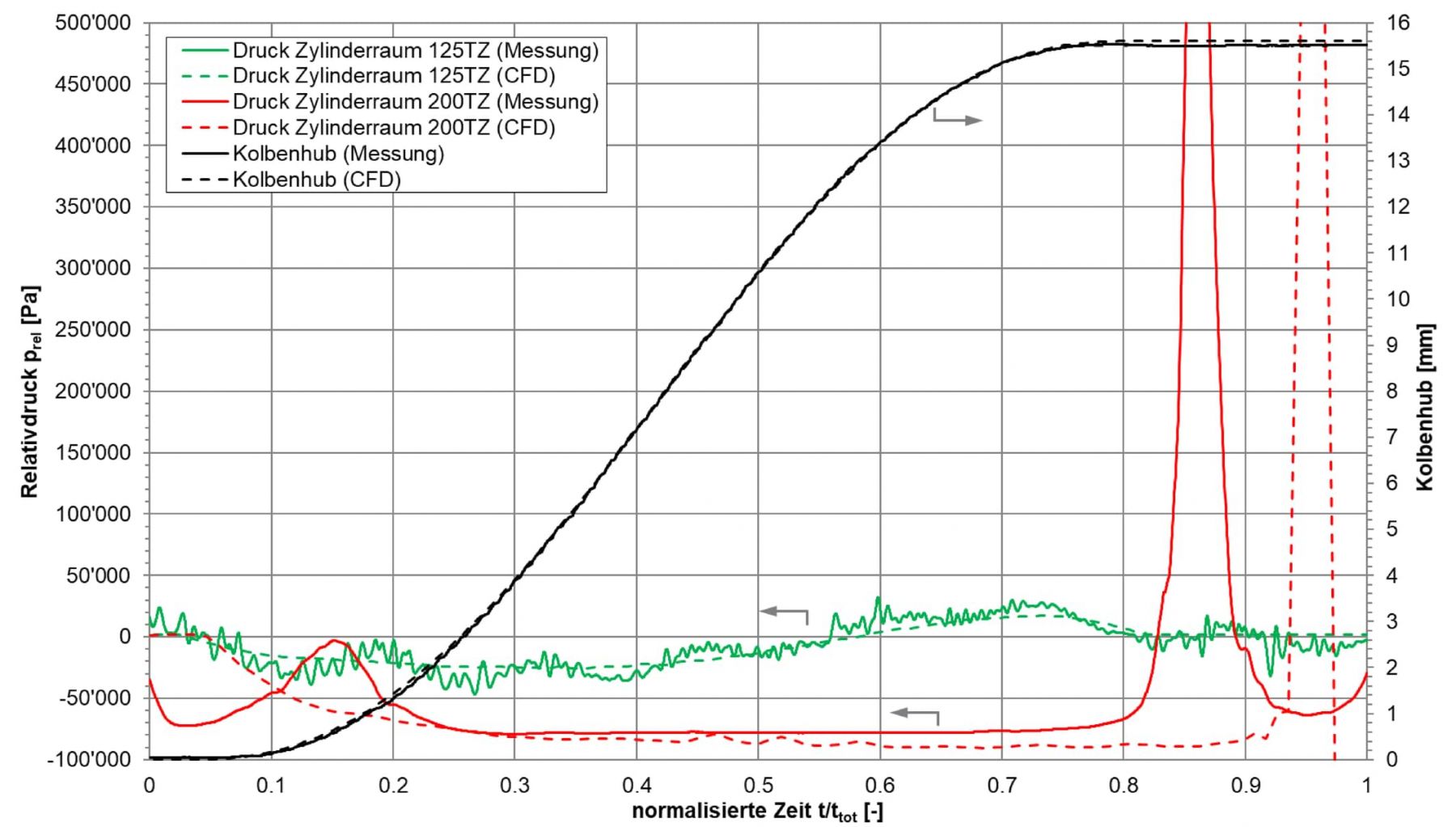 Im Gegenzug wird bei einer Taktzahl von 200 der Sättigungsdampfdruck (ca. 3160 Pa Absolutdruck bei 25 °C) erreicht und Kavitation tritt auf. Die Druckspitzen von über 500'000 Pa bei einer normalisierten Zeit von 0.8 – 1 sind ein Indiz für Dampfschlag beziehungsweise die Implosion der Gasblasen. Es zeigte sich anhand der Simulationen und den Messungen, dass erste Kavitationseffekte ab einer Taktzahl von 140 auftreten.