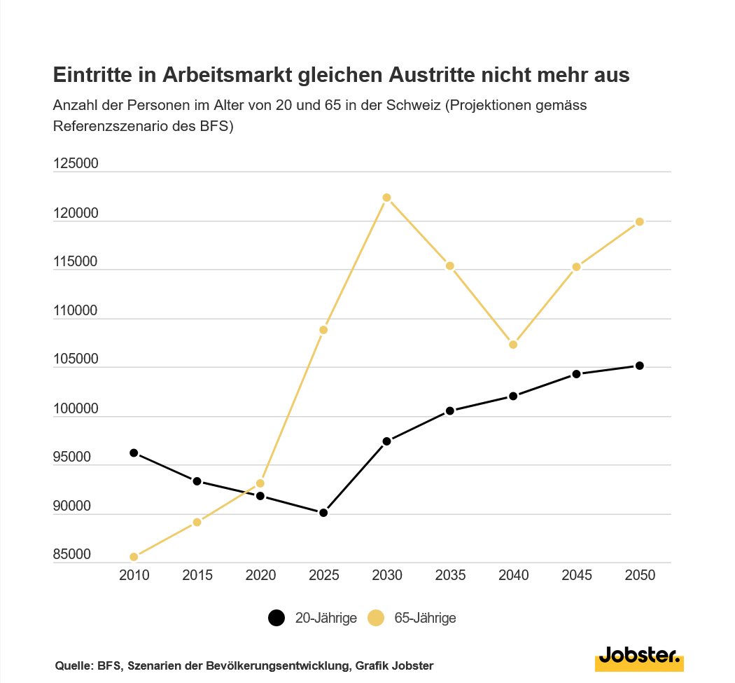 Während die Nachfrageseite konjunkturabhängig ist, sind die Entwicklungen auf der Angebotsseite der Arbeitskräfte klar: Die Babyboomer gehen in Pension und die Neueintritte in den Arbeitsmarkt können diese nicht kompensieren. Diese Lücke dürfte ihren Höhepunkt im Jahr 2030 erst noch erreichen (siehe Grafik).