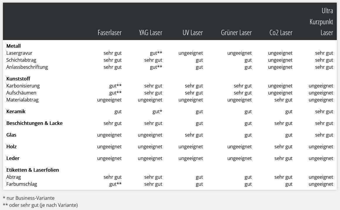 CO₂-Laser eignen sich beispielsweise gut für die Beschriftung von Kunststoffen und organischen Materialien, während Faserlaser für Metallbeschriftungen bevorzugt werden. YAG-Laser bieten eine hohe Pulsenergie und eignen sich gut für tiefe Gravuren. UV-Laser werden häufig für empfindliche Materialien wie Glas und Kunststoff verwendet. Grüne Laser eignen sich besonders gut für die kontrastreiche Beschriftung von Kunststoffen. Auch Gold, Silber, Platin, Kupfer oder andere stark reflektierende Materialien können schnell und präzise beschriftet werden. Ultrakurzpulslaser kommen zum Einsatz, wenn filigrane Beschriftungen gemacht werden sollen und die Materialien besonders schonend beschriftet werden müssen. Die Wahl des richtigen Lasertyps hängt zum grossen Teil von der Reaktion der Wellenlänge mit dem zu beschriftenden Material ab.