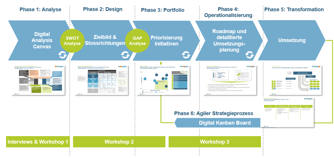 - In Phase 6 – agiler Strategieprozess unterstützt ein digitales Kanban Board bei der agilen Weiterentwicklung der Digitalstrategie