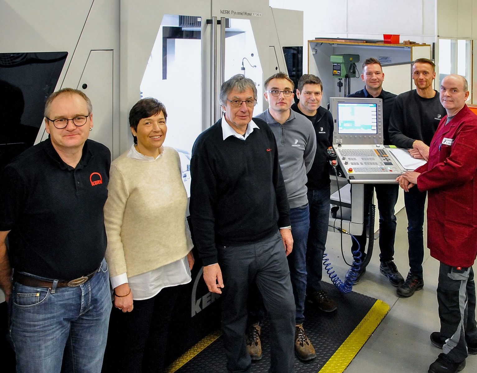 In einem ausführlichen Auswahlprozess konnte sich schliesslich die Kern Microtechnik GmbH mit einem speziell modifizierten 5-Achs-Fräszentrum vom Typ Kern Pyramid Nano gegen die Wettbewerber durchsetzen. In der Maschine wurde unter anderem ein um 200 mm abgesenkter Arbeitstisch realisiert, und sie bekam zur Automatisierung einen Werkstückwechsler vom Typ Erowa. Ein Gesamtpaket, mit dem sich das Team der Friedlein GmbH & Co. KG nach gut einem halben Jahr Arbeit mit der neuen Maschine vollauf zufrieden zeigt. «Das Volumen, das wir früher mit zwei Maschinen gefertigt haben, produzieren wir nun allein mit der Kern Pyramid Nano», berichtet Siemon.