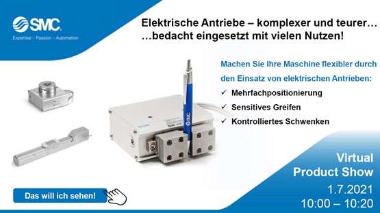SMC stellt die Vorteile elektrischer Antriebe, insbesondere bezogen auf Greifen und Schwenken, in einer «Virtual Product Show» live vor.
