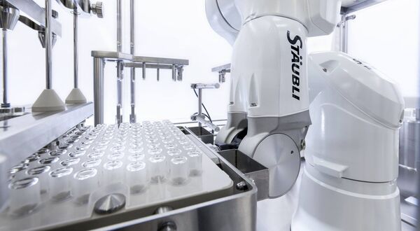 Dazu wird die Hyaluronsäure in einem Reinraum gemischt, durch den Roboter der Marke Stäubli in sterile Gefässe abgefüllt und unter Vakuum mit einem Stopfen verschlossen. Noch sind Roboter in diesem Anwendungsbereich nicht Standard, die Vorteile liegen jedoch auf der Hand: Die Robotertechnologie reduziert Bedienereingriffe und sichert die Einhaltung der Reinraumanforderungen im Betrieb.