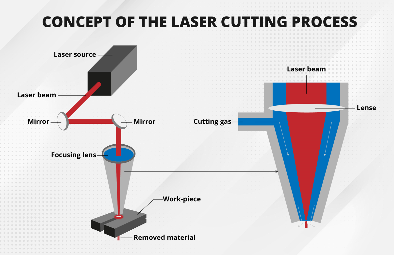 In der Industrie sind verschiedene Laserstrahlquellen in Gebrauch, vor allem der CO₂-Laser. Dabei wird CO₂ durch eine hohe elektrische Spannung so angeregt, dass Licht mit einer Wellenlänge von 10,6 µm entsteht. Der Laserstrahl wird durch Spiegel zur Optik geleitet, wo er gebündelt und fokussiert wird, um die erforderliche Leistungsdichte zu erreichen. Die hohe Energie des Laserstrahls lässt das Material schmelzen und durchtrennt es so. Ein begleitendes Prozessgas wird verwendet, um das abgetragene Material aus der Schnittfuge zu entfernen und die Optik vor Dämpfen und Spritzern zu schützen.