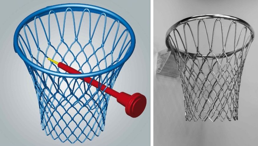 Der Basketballkorb wurde auf einem 5-Achs-Bearbeitungszentrum Grob G350 unter anderem mit einem konischen Tonnenfräser von OSG bearbeitet. Ausgehend von einem über 80 kg schweren Aluminiumblock wurde mit einem 320 mm langen Schneidwerkzeug ein Basketballkorb mit 565 g gefräst – 99,3 Prozent des Materials wurden zerspant. Die Anwendung soll die Leistungsfähigkeit von Hypermill für die komplexe 5-Achs-Simultanbearbeitung zeigen – einschliesslich des Fräsens tiefer Taschen und der Bearbeitung gewölbter Flächen. Die hervorragende Kollisionskontrolle erlaubte es, extrem enge Konturen mit einem langen Fräser auszuführen – durch eine Seite des „Netzes“ hindurch auf die andere Seite.