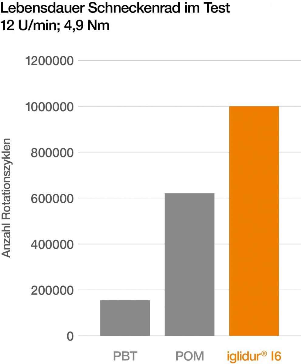 Im Test wurde ein Schneckenrad mit 5 Nm Drehmoment und 12 U/min getestet. Dabei blieb das Zahnrad aus dem Lasersintermaterial PA12 bereits nach 521 Zyklen stehen, da der Reibwert so hoch angestiegen war. Das Zahnrad aus dem neuen Lasersintermaterial Iglidur I6 zeigte nach 1 Millionen Zyklen lediglich einen geringen Verschleiss auf und war noch voll funktionsfähig. Im Test konnte sich Iglidur I6 auch deutlich gegenüber gefrästen Zahnräder behaupten. Zahnräder aus POM wiesen bereits nach 621.000 Zyklen einen totalen Verschleiss auf, während gefräste Zahnräder aus PBT schon nach 155.000 Zyklen brachen.