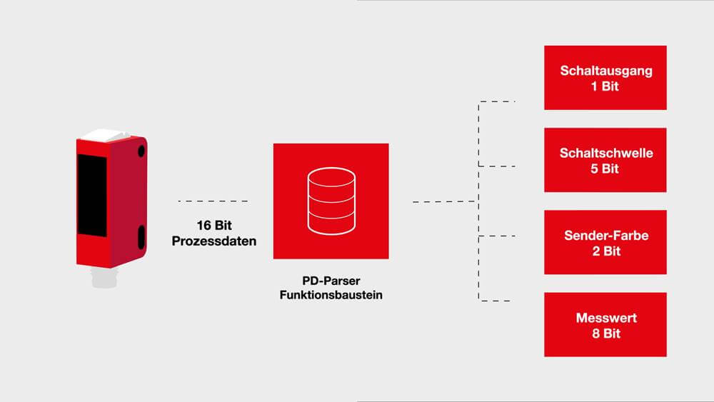 Jeder Funktionsbaustein ist massgeschneidert für einen IO-Link-Sensor von Leuze. Anwender sparen mit den software-basierten Bausteinen Zeit. Aufwändiges Suchen nach Datentypen, Parameter-Indizes und Prozessdatenstrukturen entfallen damit. Zudem werden mögliche Fehler bei der Integration von IO-Link Gerätedaten vermieden. Anwender können Diagnosedaten sogar im laufenden Prozess erheben und für Optimierungen verwenden. Dank der Prozessdaten-Parserfunktion sind einzelne Bestandteile der Prozessdaten leicht zugänglich.