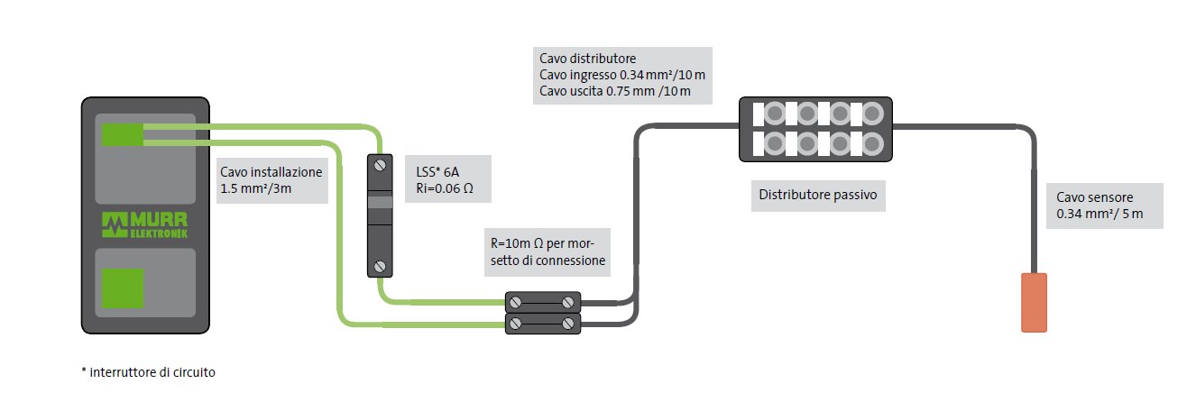 Applicato alla formula U = R x I, ciò significa che è possibile un flusso di corrente massimo di 18,18 A in un'alimentazione a 24 V controllata elettronicamente. Tuttavia, ciò non è sufficiente per sganciare un interruttore automatico di tipo C con corrente nominale pari a 6 A. Come descritto, richiederebbe almeno 84 A.