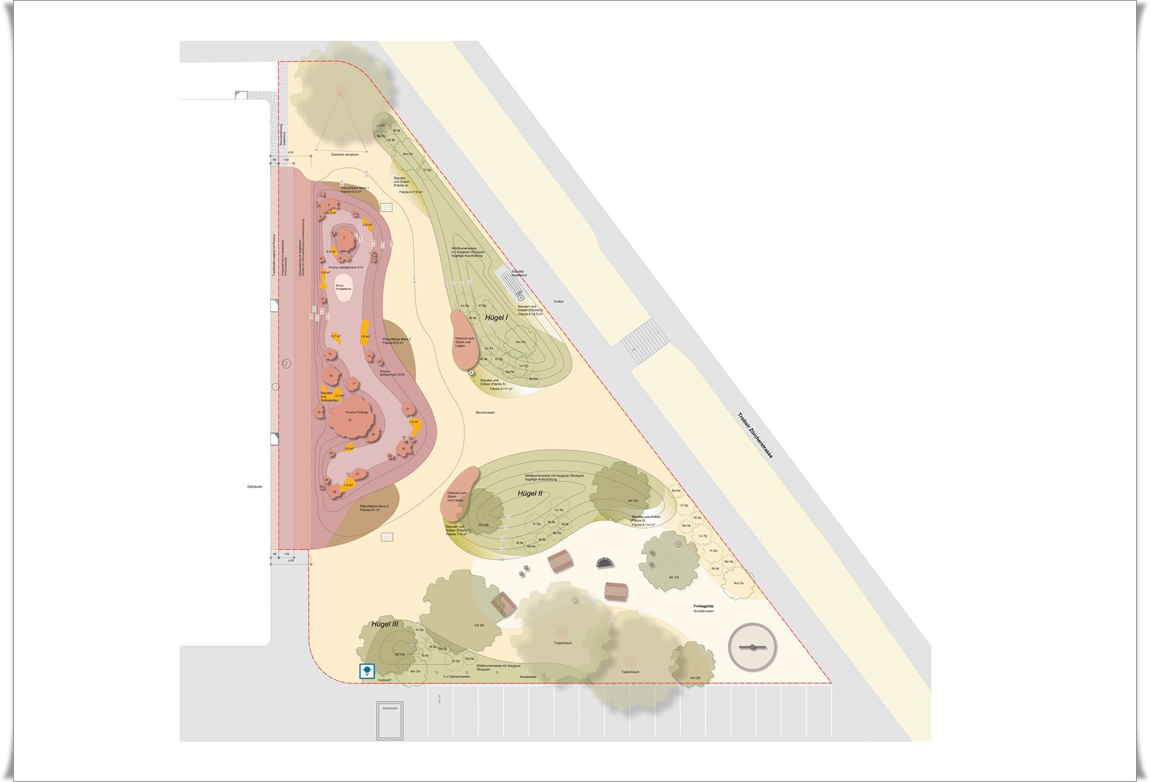 Die aufgeteilte Grünfläche umfasst eine Marslandschaft. Dies ist eine rötliche Fläche als Übungsplatz für den Mars-Rover, die Interesse an Raumfahrt, Technologie und Bildung für alle Altersgruppen wecken soll. Dazu gibt es ein Umwäldchen – ein Ort der Entspannung und Begegnung, der zudem einen positiven Umweltbeitrag leistet.