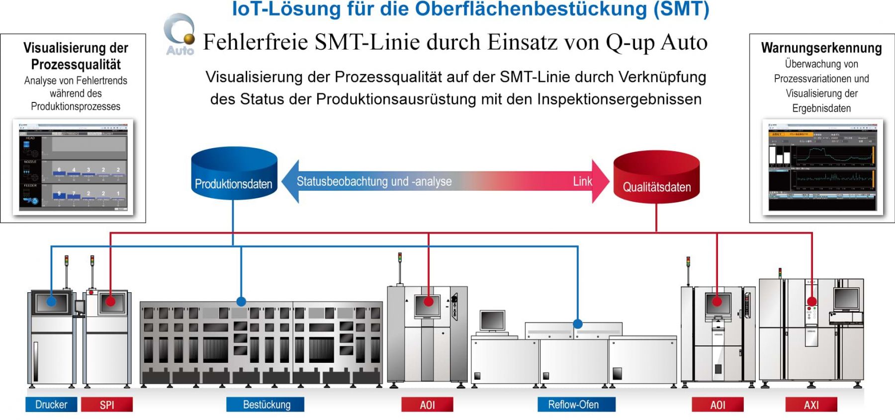 Neben den beiden Inspektionssystemen stellt Omron auch die IoT-Lösung Q-up Auto vor. Mittels der Qualitätsdaten, die in der SMT-Linie erzeugt werden, sowie durch die Daten, die dank der 3D-SJI-Technik gewonnen werden, überwacht Q-up Auto Variationen bei den Messwerten selbst während der Produktion von Baugruppen in guter Qualität und entdeckt dabei Anzeichen von Mängeln.