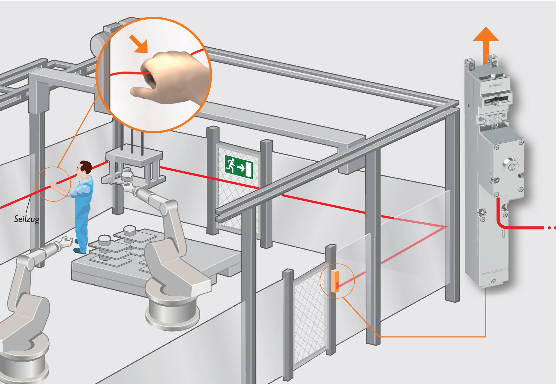 Sind Schutzeinrichtungen zur Absicherung von begehbaren Gefahrenbereichen mit elektromechanischen Zuhaltungen (Verriegelungen) ausgestattet, kommen oft Fluchtentriegelungen als Einsperrschutz zum Einsatz. Voraussetzung für die sinnvolle Nutzung einer Fluchtentriegelung ist jedoch, dass die eingesperrte Person im Notfall die Fluchttür noch rechtzeitig erreichen und öffnen kann. Ist dies nicht der Fall, z. B. in ausgedehnten oder unübersichtlichen Gefahrenbereichen, kommt eine Standard- Fluchtentriegelung nicht in Frage. Stattdessen empfiehlt sich für diese Applikationen eine Fluchtentriegelung über Seilzug, welche die Tür aus grösserer Entfernung öffnen kann, oder ein Persönlicher Schlüssel.