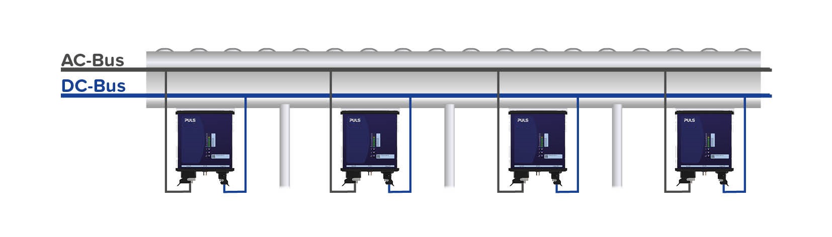Lösungsansatz 1 und 2 zeigen, dass viele Unternehmen bereits selbst aktiv geworden sind, da sie die Vorteile einer dezentralen Stromversorgung erkannt haben. Weitläufige Anwendungen, wie Förderbänder oder Fertigungslinien, können dezentral deutlich effizienter und flexibler mit Energie versorgt werden. Dank einer Installation der Stromversorgung direkt neben der Last, können kürzere Kabel mit geringerem Querschnitt verlegt werden. Das spart Kosten für Kupfer und die Stromversorgung muss nicht länger überdimensioniert werden.