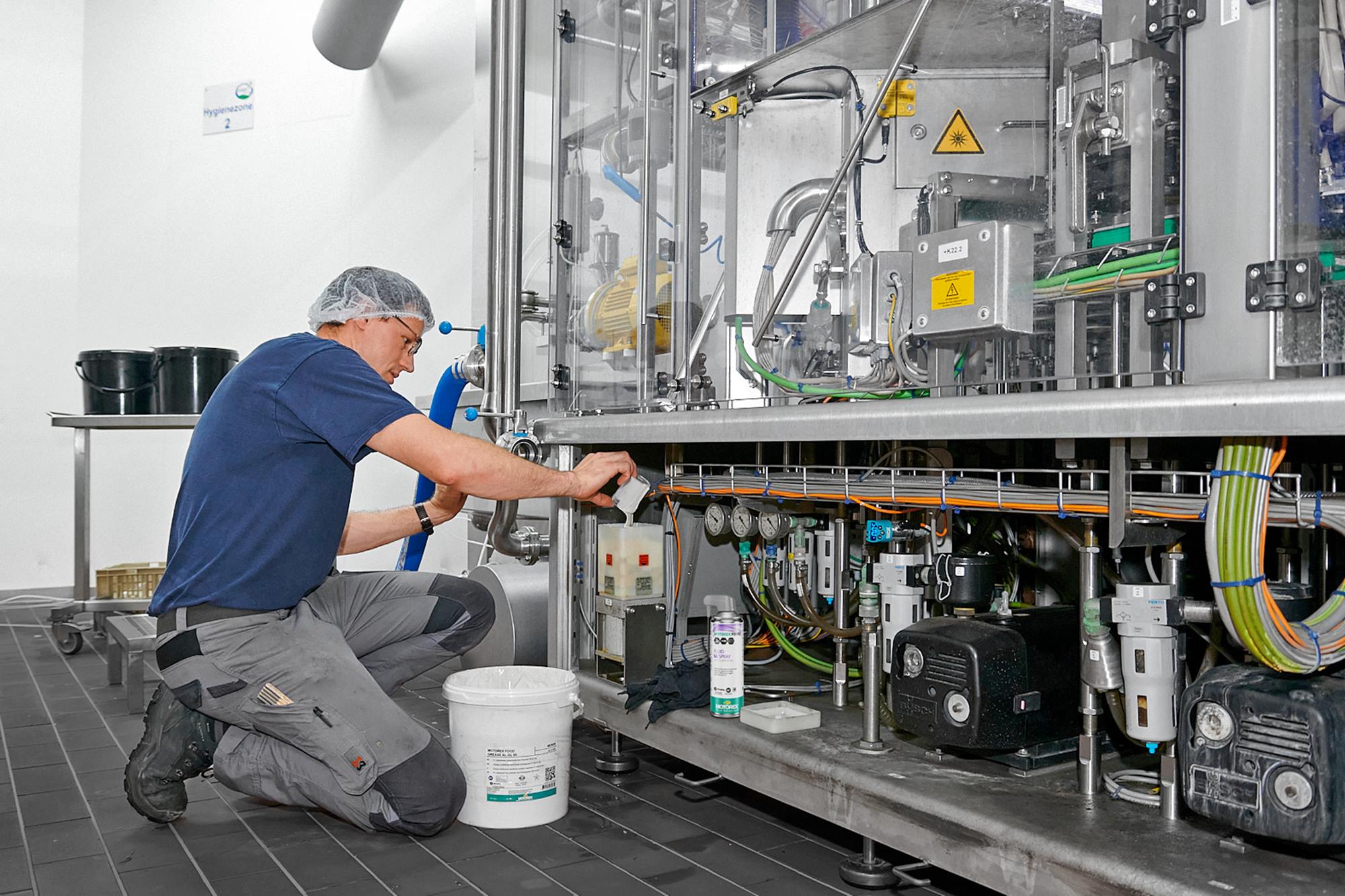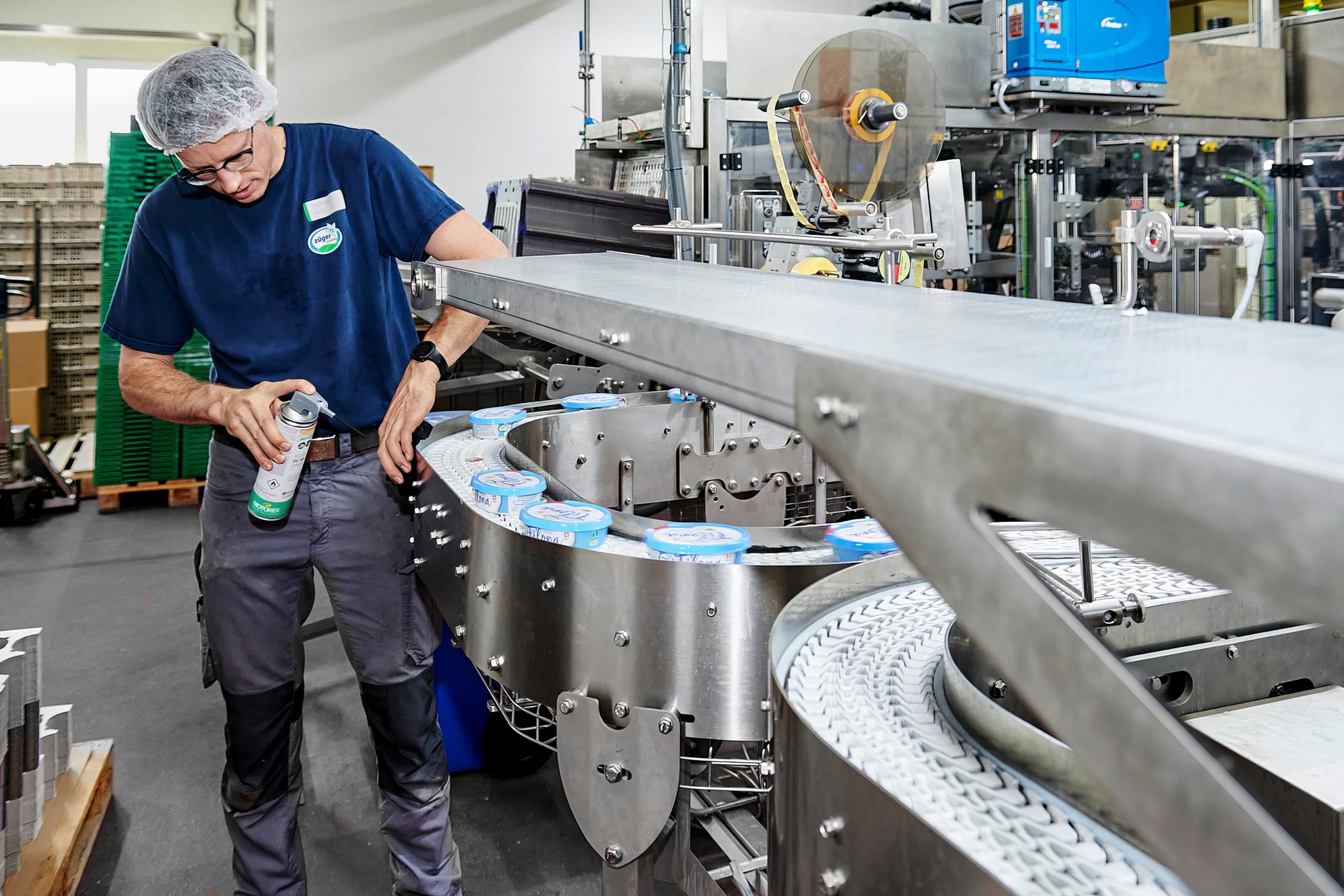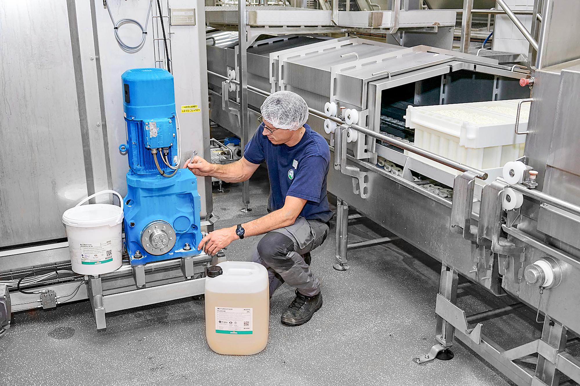 Thomas Jung ist verantwortlich für den technischen Unterhalt des gesamten Maschinenparks. «Das sind schnell mal um die 100 Maschinen. Gibt es Ausfälle, interveniert unser Team rund um die Uhr. Sämtliche Maschinen werden wöchentlich kontrolliert und punktuell gewartet. Revisionen und grössere Wartungsarbeiten werden einmal im Jahr durchgeführt. Dazu verwenden wir auch Produkte von MOTOREX. Einerseits stammen diese aus dem Basissortiment und andererseits setzen wir spezielle lebensmitteltaugliche Schmierstoffe und Betriebsmittel aus der FOOD LINE ein. Je nach Kontaminationsrisiko sind diese in verschiedene Klassen eingeteilt (H1, 3H oder K1), was bedeutet, dass selbst ein unbeabsichtigter und direkter Kontakt mit Lebensmitteln unbedenklich ist.»