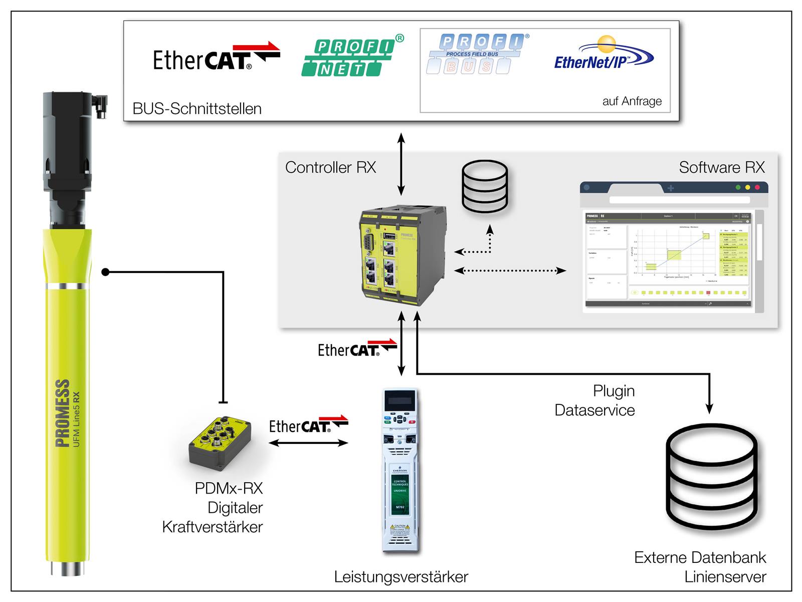 Herzstück ist der Controller RX zur parallelen Steuerung von bis zu vier Mechaniken und 16 Sensoren. Mit einer Abtastfrequenz von 2 kHz lassen sich Montageprozesse, sowie Mess- und Prüfaufgaben präzis steuern und überwachen. Schnelle Programmladezeiten und eine schnelle Verarbeitung der Prozessdaten reduzieren die Zykluszeit. Die Datenauswertung erfolgt direkt im Controller RX. Es lassen sich Programme und Prozesskurven speichern. Die gespeicherte Prozessdaten können über ein Datendienst abgeholt und direkt weiterverarbeitet werden. Die Übertragung zur übergeordneten SPS ist aufgrund des performanten Echtzeit-Bussystems schneller als bisher.