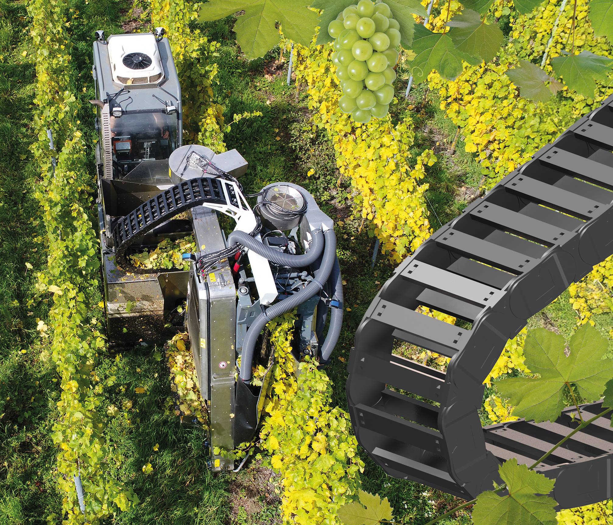 Eine wesentliche Leistung der Ingenieure lag in der Entwicklung eines Fahrzeugs, das den rauen Bedingungen des Weinbergs dauerhaft trotzt und gleichzeitig den Wartungsaufwand für Winzer minimiert. Der Schlüssel zum Erfolg: eine durchdachte Bauteilwahl. Die Ingenieure entschieden sich unter anderem für Energieketten aus Hochleistungskunststoff von Igus, um die hydraulischen und elektrischen Leitungen vom Fahrzeug zum Erntekopf zu führen. Die e-Ketten verhindern nicht nur das Abknicken und Verklemmen der Leitungen, sondern eliminieren auch das Risiko, dass sich diese in den Rebstöcken verfangen.