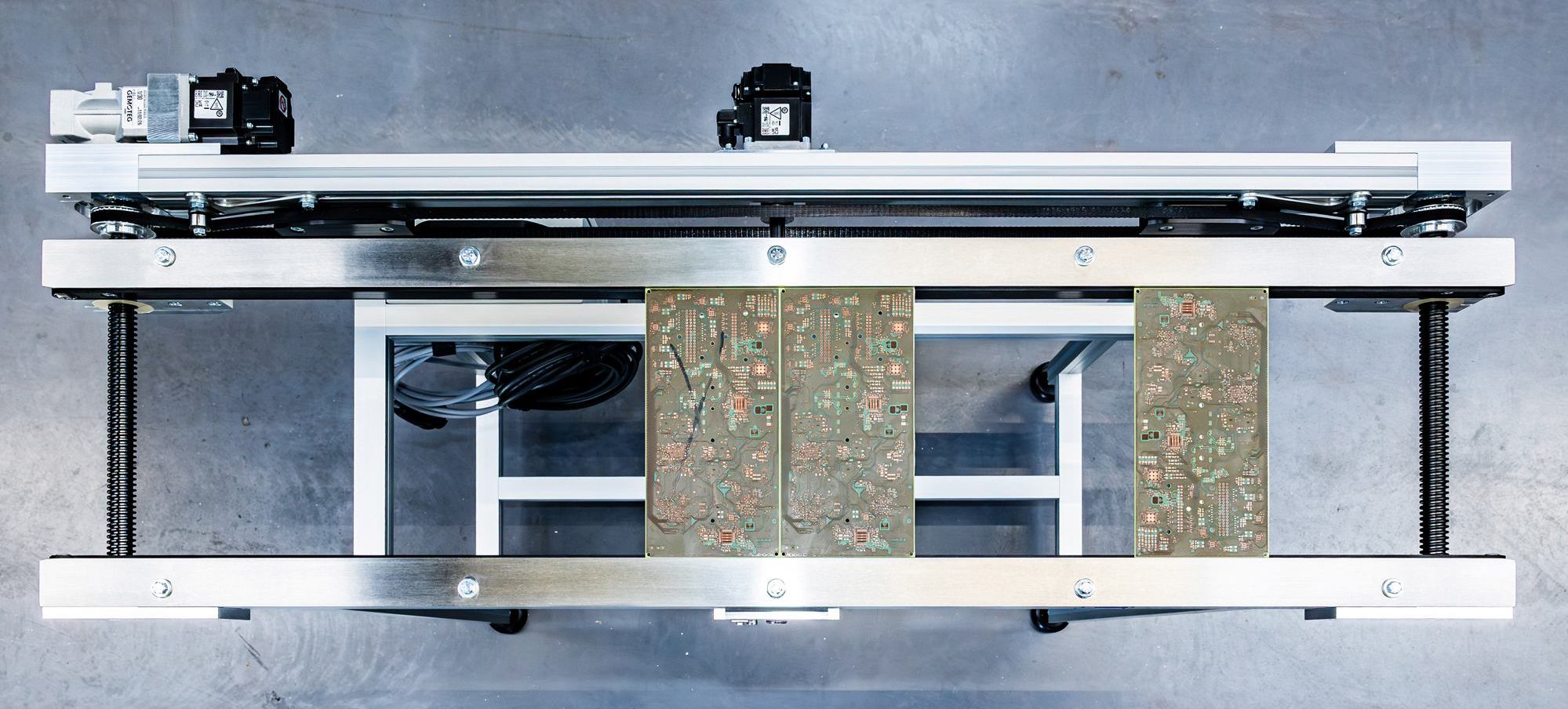 Die neue Platinen-Förderstrecke wurde von Schnaithmann speziell für den sicheren und schonenden Transport von Ultra-High-ESD-sensitiven Produkten konzipiert. Die Materialien der Riemen, Gleitleisten, Aluminiumprofile und anderer Komponenten sind in Kombination ESD-tauglich. Die Breite der Förderstrecke ist über einen kleinen Servomotor mittels einer Trapezgewindespindel stufenlos an die Masse der jeweiligen Platinen anpassbar. Auch die Geschwindigkeit lässt sich stufenlos regeln und gewährleistet so den sicheren Transport der empfindlichen Printed Circuit Boards.