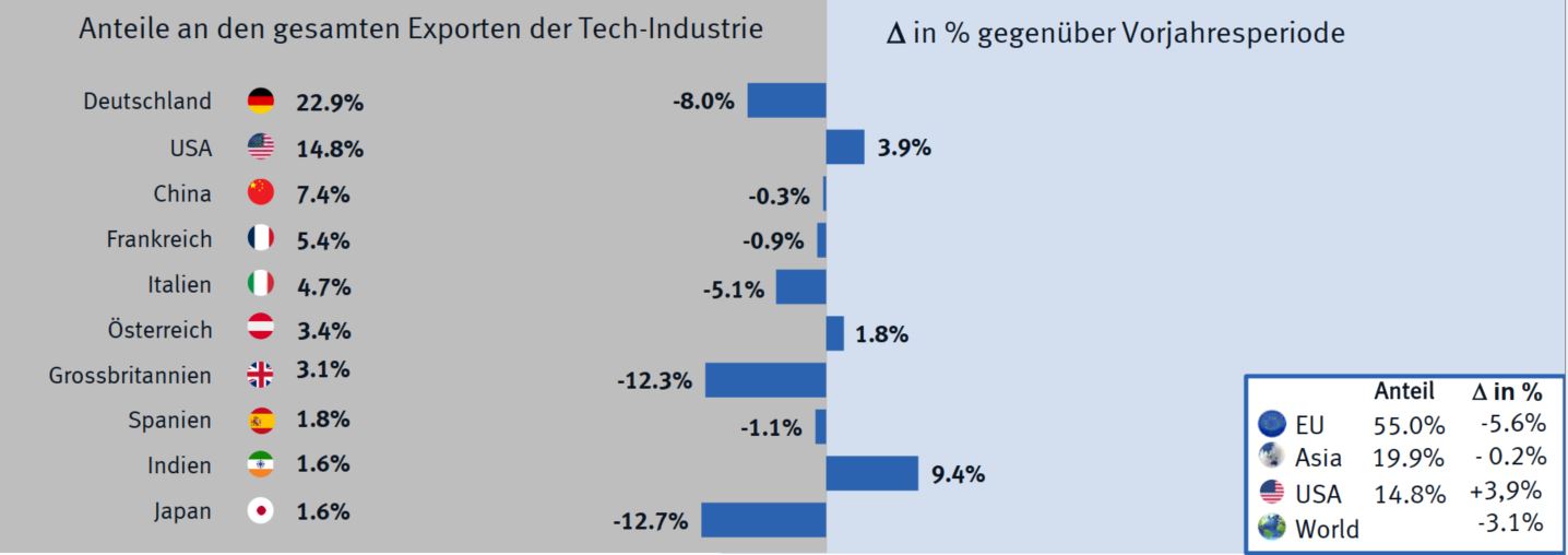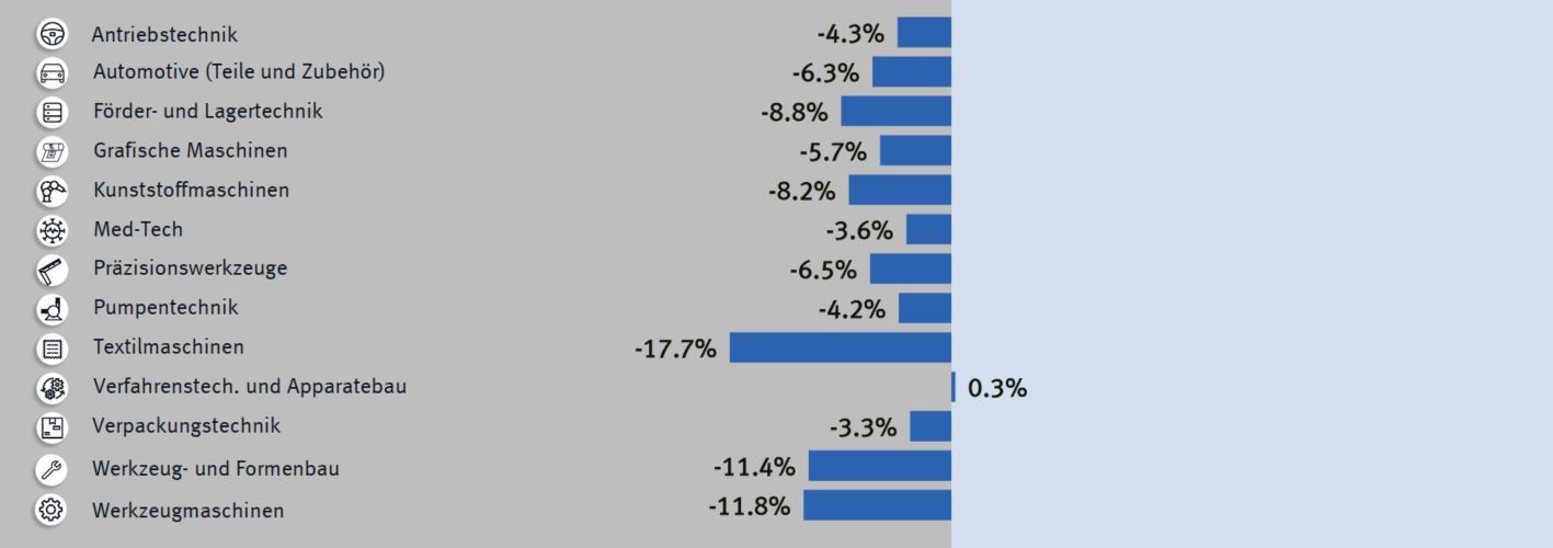 Die Auftragseingänge blieben auf dem Niveau des Vorjahres. Besonders betroffen war der Maschinenbau mit einem Rückgang von 4,9 Prozent. Ein Lichtblick waren die Exporte nach Indien (+9,4 Prozent) und in die USA (+3,9 Prozent), doch konnten diese die Einbussen in der EU (-5,6 Prozent) nicht ausgleichen.