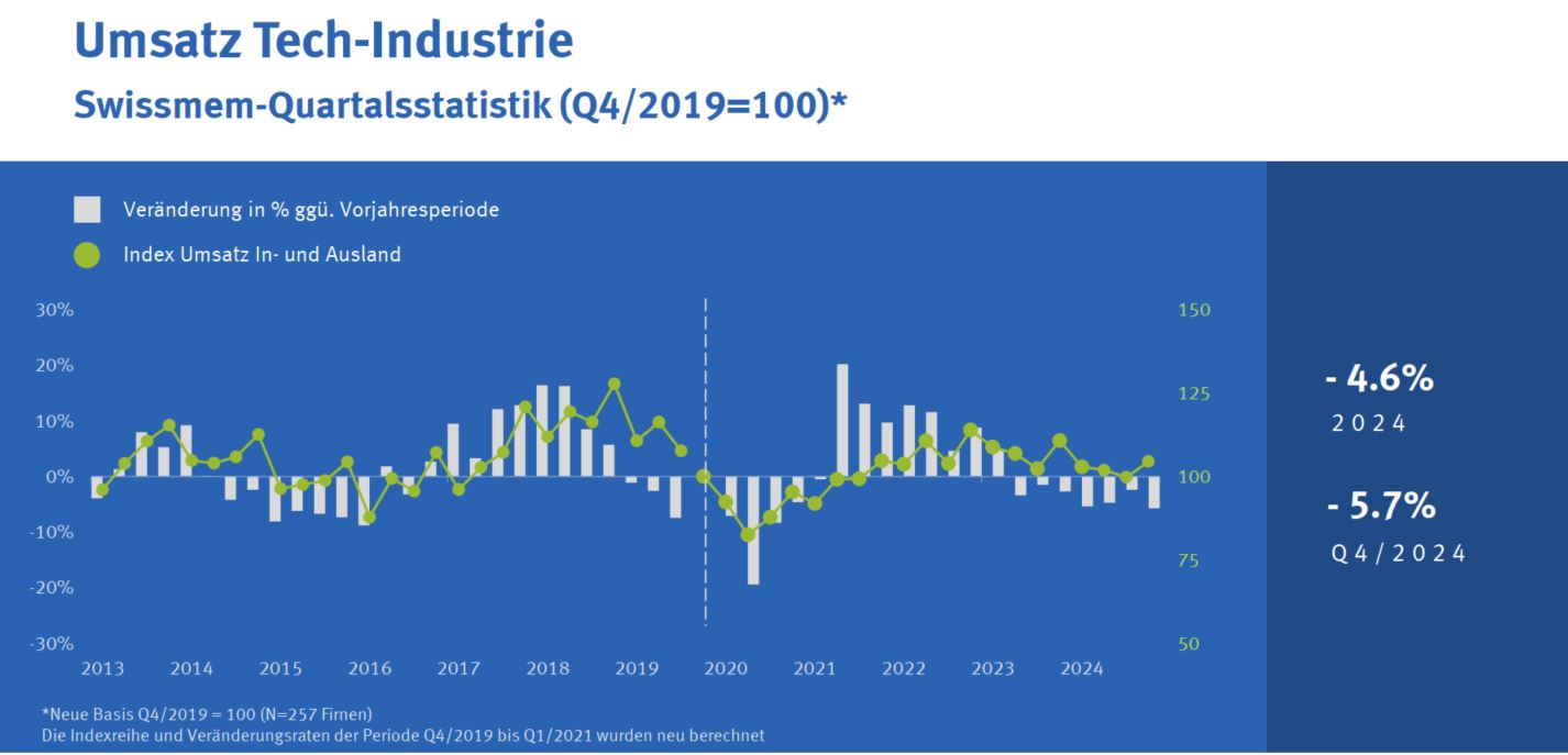Die Schweizer Tech-Industrie, bestehend aus der Maschinen-, Elektro- und Metall-Industrie sowie verwandten Technologiebranchen, erlebte 2024 ein schwieriges Jahr. Laut Swissmem sanken die Umsätze um 4,6 Prozent, während die Exporte um 3,1 Prozent zurückgingen.