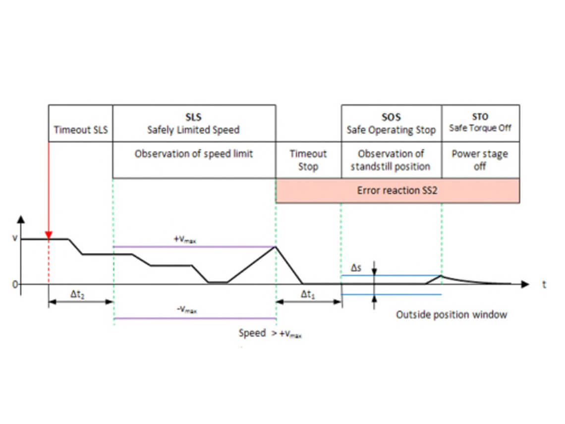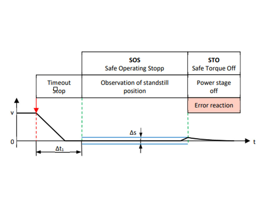 - SS2 (Safe Stop 2): überwacht die Verzögerung und hält den Motor unter Spannung (SOS - Safe Operating Stop), sobald er zum Stillstand gekommen ist. Dabei wird das Drehmoment erzeugt und die Position konstant überwacht.