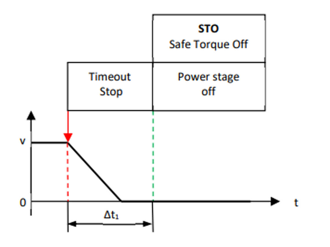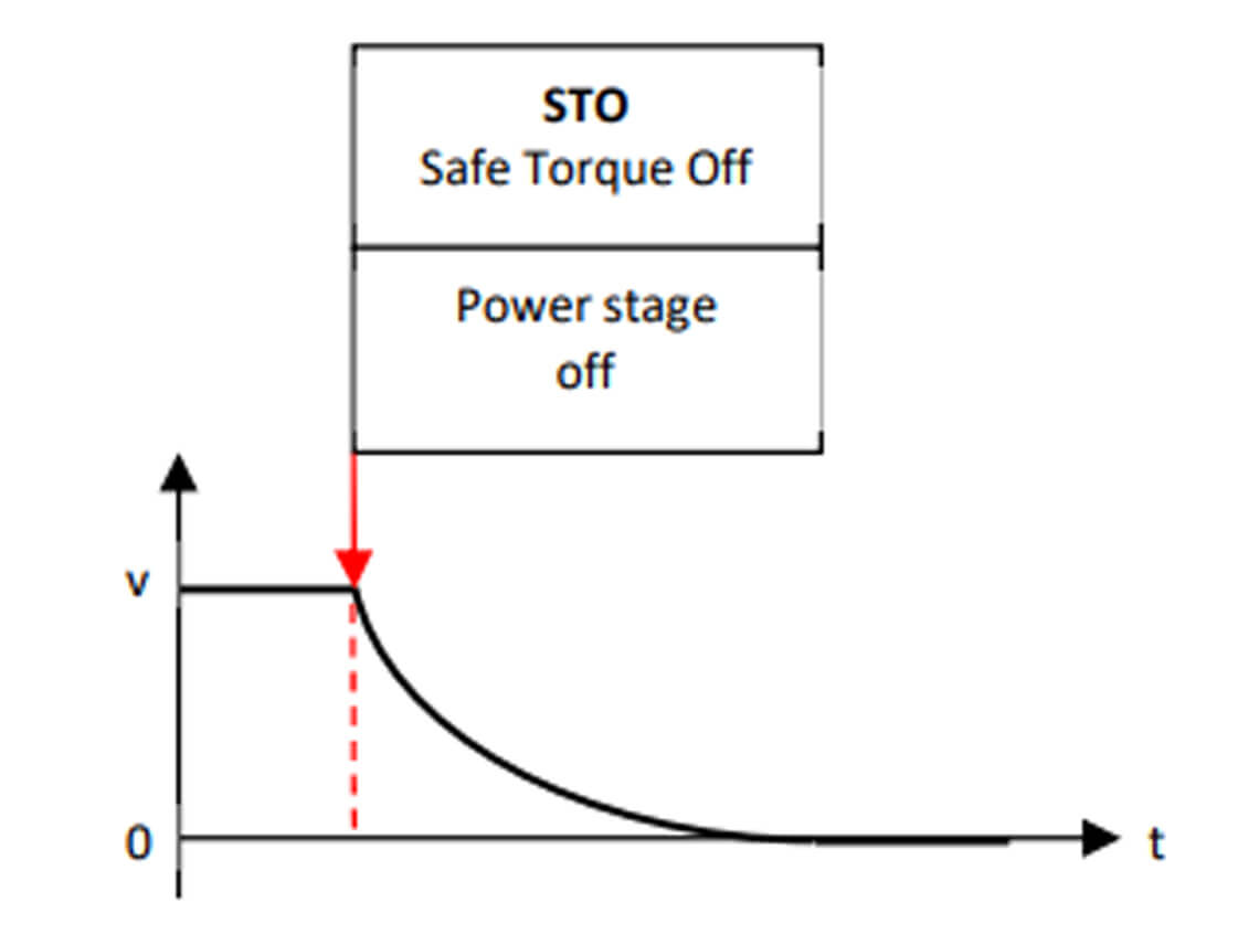 - STO (Safe Torque off): verhindert, dass drehmomenterzeugende Energie auf den Motor einwirkt und stoppt die Stromversorgung, während der Motor im Freilauf weiterläuft.