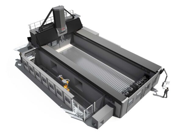 Auftaktbild: Kennzeichen HD: Die neue Droop+Rein FOGS HD (Heavy Duty) schlichtet aufgrund der hohen Maschinendynamik rund 20 bis 30 % schneller und wirtschaftlicher als eine vergleichbare Portalfräsmaschine. Grafik: Starrag