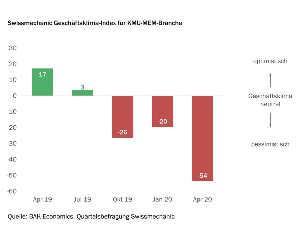 Der Swissmechanic Geschäftsklima-Index zeigt, dass sich die Lage der befragten KMU im April dramatisch verschlechtert hat. Die Branche hat jedoch rasch reagiert: 67 Prozent haben Kurzarbeit beantragt und 34 Prozent einen Überbrückungskredit. Nur 16 Prozent mussten Entlassungen aussprechen.