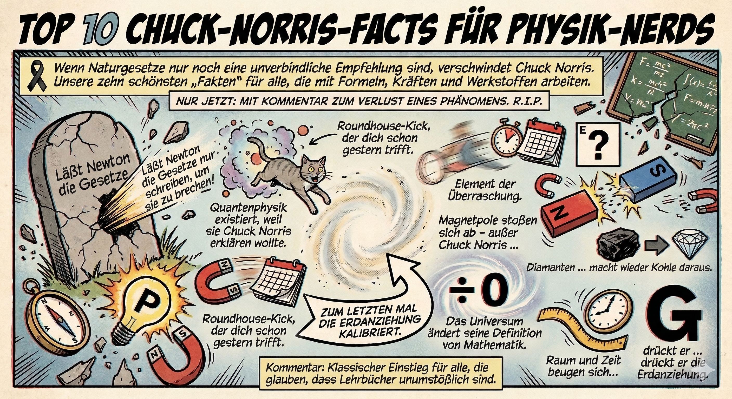 Chuck Norris ist nicht mehr unter uns. Die Schwerkraft atmet auf. Zu Lebzeiten war er das einzige Meme, vor dem die Physik zitterte. Newton, Quantenmechanik, Legacy-Code: Alles folgt Regeln. Es sei denn, Chuck Norris hatte andere Pläne. Wer jetzt die Naturgesetze überwacht, ist unklar. Unsere Top-10-Listen zeigen aber, was passiert, wenn Ingenieurhumor auf Kultfigur trifft.