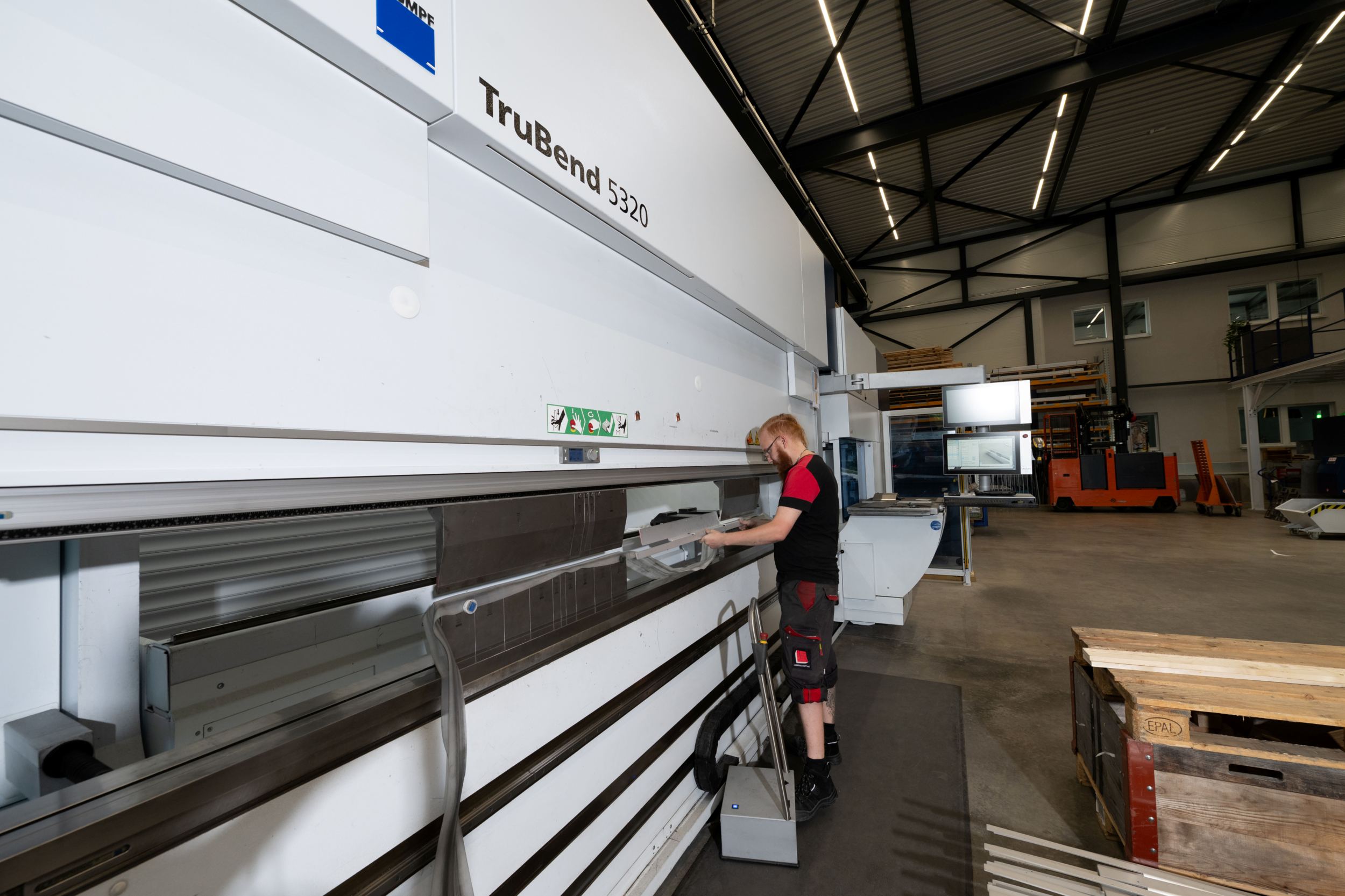 Auf der Rückseite des Lagers folgt die TruLaser 5030 mit dem LiftMasterCompact, der mit dem schnellsten Wechselspiel bei den Kassetten die Be- und Entladung automatisch steuert. Einige Schritte entfernt, aber luftig positioniert, stehen die Abkantpressen TruBend 5085 und TruBend 5320 mit dem automatischen ToolMaster, der den Werkzeugwechsel selbständig erledigt und seine Stärke vor allem bei kleinen Losgrössen ausspielt, indem er die Rüstzeiten auf ein Minimum reduziert.