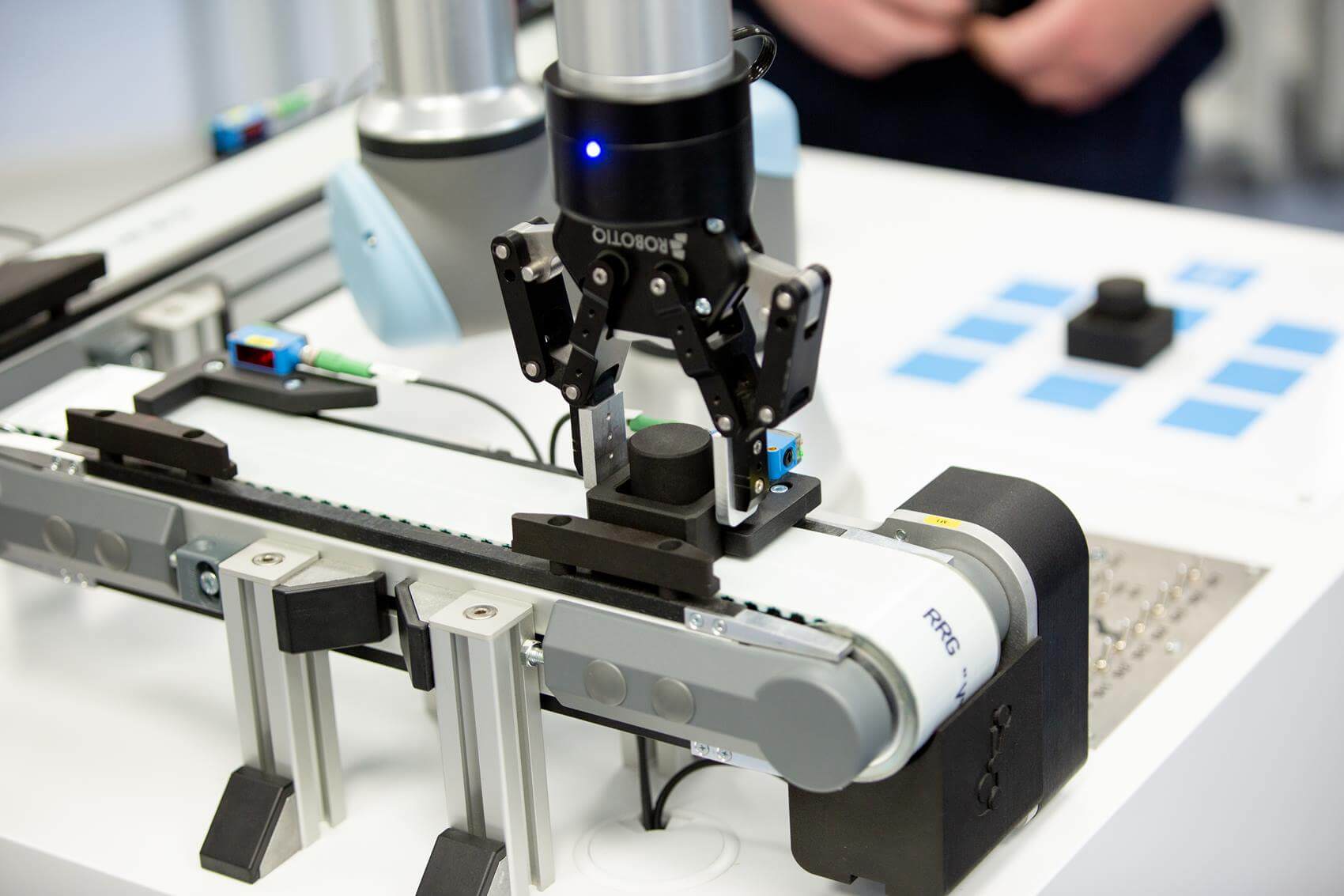 Zunächst fiel die Wahl auf ein konventionelles, klassisch ausgelegtes Modell, das den Lernenden einen ersten Einblick in die praktische Automatisierungstechnik liefern sollte. Gleichzeitig trennte aber aufgrund seines Einsatzgebietes eine Schutzumhausung die Schüler*innen von dem Roboter, weshalb die Lehrerschaft das Angebot der Berufsschule um einen kollaborierenden Leichtbauroboter ergänzte. «Wir haben gesehen, dass das Thema Robotik sowohl in der Industrie als auch in der Lehre immer wichtiger wird. Wir entschieden uns deshalb, einen kollaborierenden Roboter von Universal Robots (UR) anzuschaffen, um den Schüler*innen zu zeigen, wie man auch Hand in Hand zusammen und sicher mit einem Roboter arbeiten kann», erklärt Muders.
