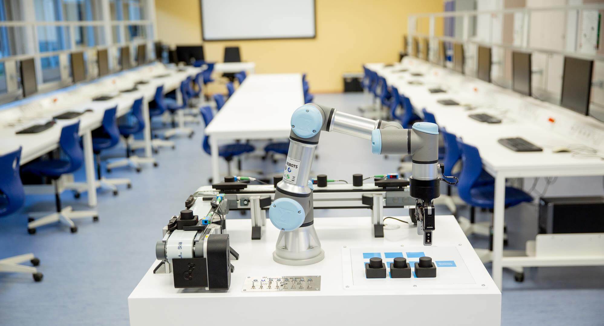 Seit diesem Schuljahr ergänzt ein kollaborierender Roboter vom Typ UR3e die Schüler*innen als neuer Klassenkamerad. Im neu geschaffenen Fach Industrierobotik werden die Lernenden nun mit Unterstützung des Cobots geschult. Die Cobot-Zelle ist Teil eines modularen Schulungskonzepts von Universal Robots. Ausgestattet mit zwei Förderbändern, einem Greifer und einem Teach Panel können sowohl Lehrer als auch Schüler Programmieraufgaben mit dem UR3e in die Tat umsetzen. Das Universal Robots Education Konzept besteht aus der Online Academy, einem Offline-Simulator, der Schulungszelle sowie umfassenden Unterrichtsmaterialien, die auf der Academy aufbauen.