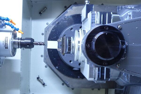 Seit März 2021 wird darauf produziert und das Werkstückspektrum hat sich damit bereits deutlich erweitert. Mit einem Störkreis von 650 mm (Versa 825 von 560 mm), einem noch grösseren Arbeitsraum mit entsprechenden Verfahrwegen werden aktuell längere Bauteile 5-achsig auf Umschlag oder Paletten 400 x 500 mm bearbeitet.