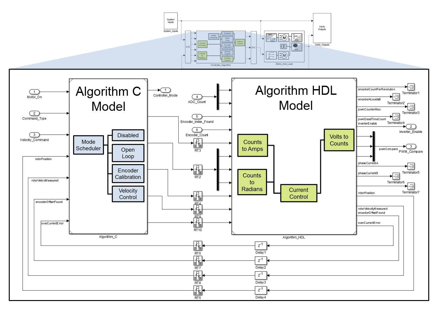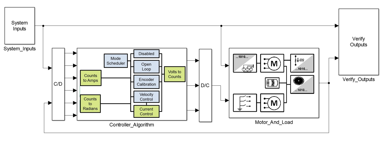 Das ursprüngliche Modell wird mit den neuen Algorithmuskomponenten ergänzt (Abbildung 4). Um die Systemsimulation zu ermöglichen, werden konzentrierte Parametermodelle bestehender Peripheriekomponenten erstellt, die mit dem Motormodell interagieren. Bestehender HDL-Code für z.B. die Peripheriekomponente Encoder, wird im bereitgestellten Entwurf wiederverwendet. Der Encoder liest einen Datenstrom digitaler Impulse bei 50 MHz und übersetzt diese in Zählersignale, die vom Regelungsalgorithmus mit 25 kHz gelesen werden.