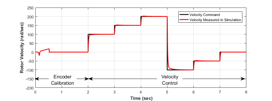Eine direkte Modellierung dieses Impulsstroms würde eine 50-MHz-Dynamik in das Systemmodell einführen und die Simulationszeit beträchtlich erhöhen. Stattdessen wird ein konzentriertes Parametermodell des Encoders erstellt, das die ideale Rotorposition aus dem Motormodell in das Encoder-Zählersignal umwandelt, das von den Algorithmuskomponenten verarbeitet wird. Modellierung auf dieser Genauigkeitsstufe ermöglicht die Simulation der zum Testen der Encoder-Kalibrierungskomponente erforderlichen Startbedingungen, sowie die Einführung von Positions-Quantisierungseffekten zum Testen der Geschwindigkeitsregelungs-Komponente (Abbildung 5) bei gleichzeitiger Wahrung angemessener Simulationszeiten.