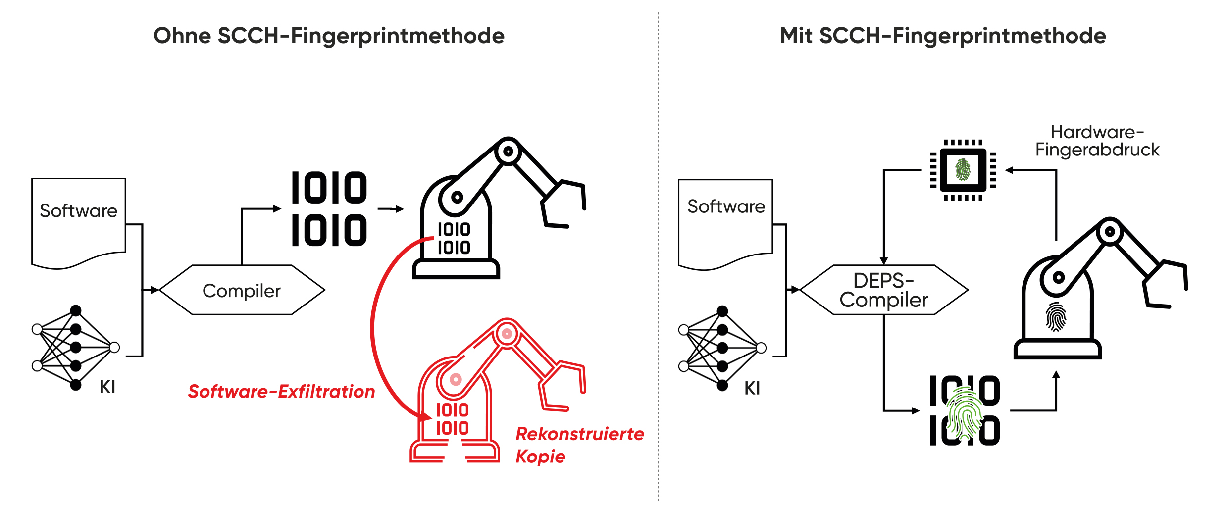 «Jeder Chip hat mikroskopisch kleine Unterschiede in seiner Struktur, verursacht durch minimale Fertigungstoleranzen. Diese Individualität machen wir uns zunutze», erklärt Bernhard Fischer vom SCCH. Die sogenannte Fingerprint-Methode bindet die Software an diese Hardwaremerkmale. Sie läuft damit nur auf der Originalmaschine korrekt. Versuche, die Software zu kopieren, scheitern an der fehlenden Signatur.