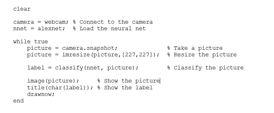 Eine der aufwendigsten Arbeiten bei der Erstellung neuer Deep-Learning-Modelle ist die Klassifizierung von Bildern zum Trainieren des Programms. Vortrainierte Netze verringern die Anzahl der dazu benötigten Bilder erheblich. Mit MATLAB und der Neural Network Toolbox können Software-Ingenieure und Wissenschaftler ohne besondere Vorkenntnisse Deep-Learning-Lösungen erstellen und sich dabei auf vortrainierte Netzwerke stützen. Das folgende Beispiel zeigt die Bilderkennung von Objekten in Echtzeit mit einer Webcam. Der Code dazu ist lediglich elf Zeilen lang und kann schnell implementiert werden, um die Technik auszuprobieren.
