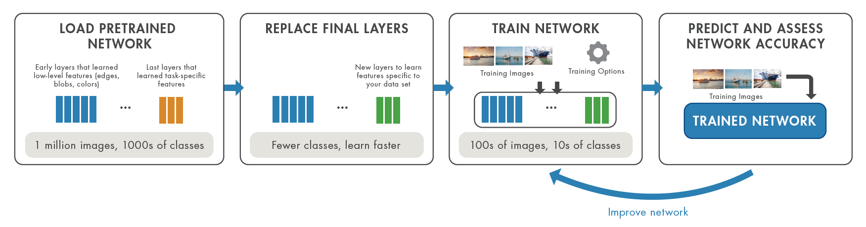 Im folgenden Beispiel wird ein vortrainiertes Netzwerk modifiziert und mittels Transfer-Lernen für eine neue Klassifikationsaufgabe trainiert. Die Feinabstimmung eines vorab trainierten Netzwerks ist viel schneller und einfacher als der Aufbau und das Trainieren eines neuen Netzwerks: Mit einer geringen Anzahl von Trainingsbildern kann das Deep Learning schnell auf eine neue Aufgabe übertragen werden. Hinzu kommt, dass das vortrainierte Netzwerk aufgrund der grossen Anzahl von Bildern, auf denen es trainiert wurde, bereits einen reichen Funktionsumfang erlernt hat.