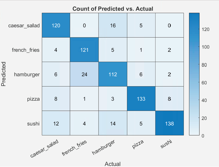 Zum Visualisieren der Genauigkeit des Netzwerkes kann eine Konfusionsmatrix angewendet werden. Der Test aus dem beschriebenen Beispiel zeigt eine Genauigkeit von 83% an. Während dies für unser Beispiel ausreicht, wäre es für eine reale Anwendung inakzeptabel. Um die Genauigkeit des Modells für eine reale Anwendung zu erhöhen, kann man weitere Iterationen durchführen, die Trainingsoptionen sowie die Daten überprüfen und das Netzwerk neu konfigurieren.